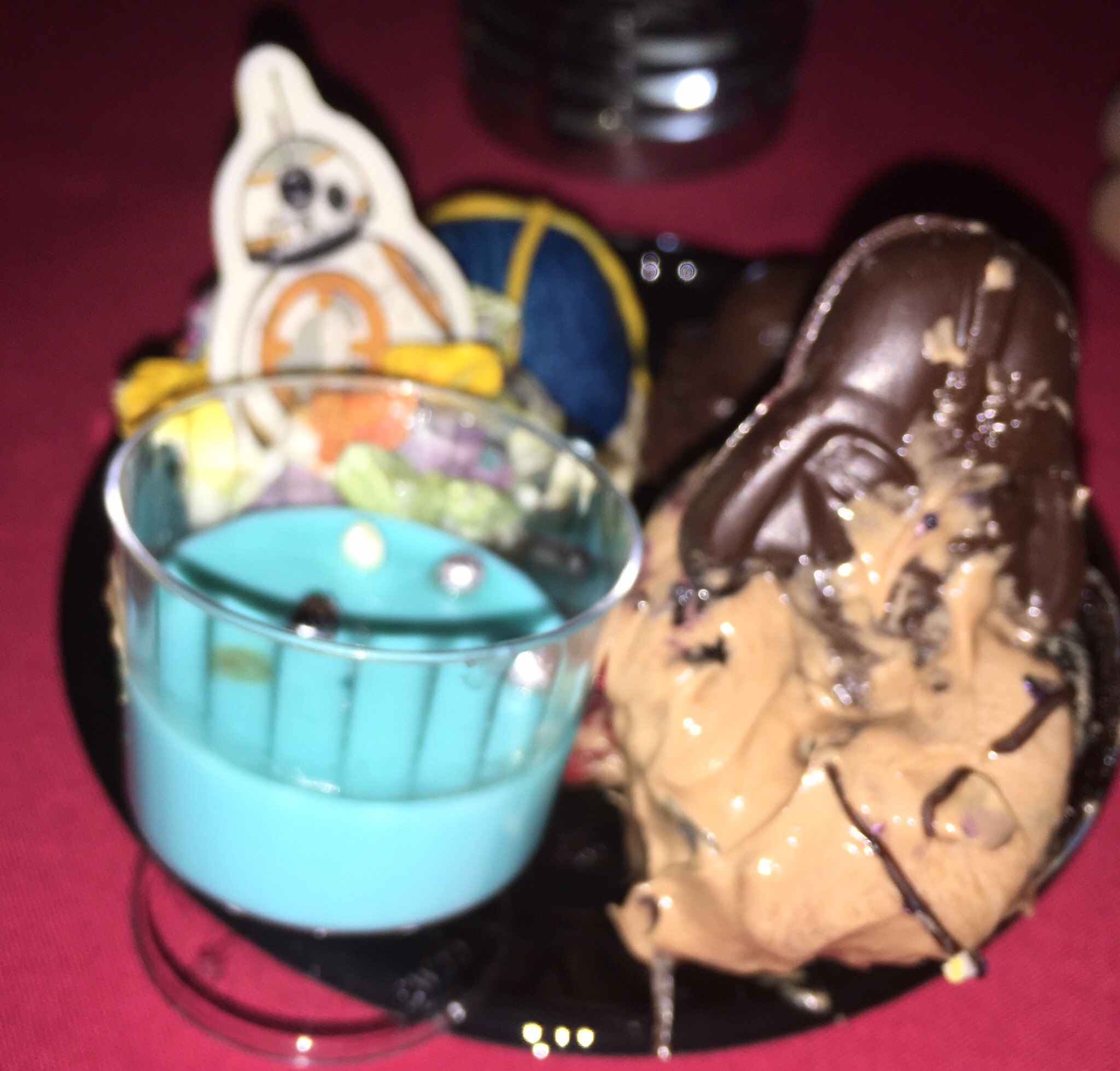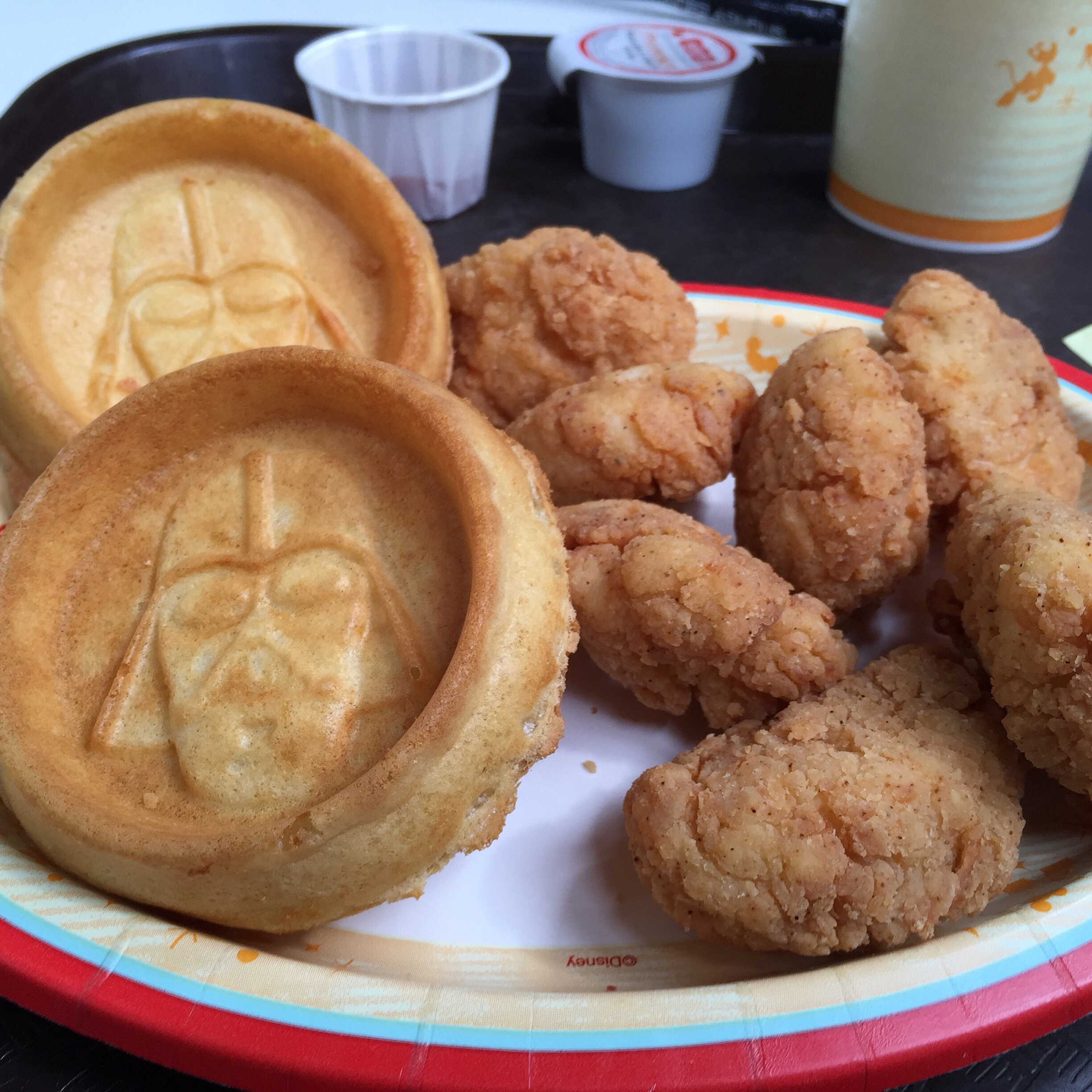 The Backlot Express has added several menu items that are Star Wars themed. I had the Dark Side chicken and waffles which was chicken nuggets with Dartg Vader waffles: